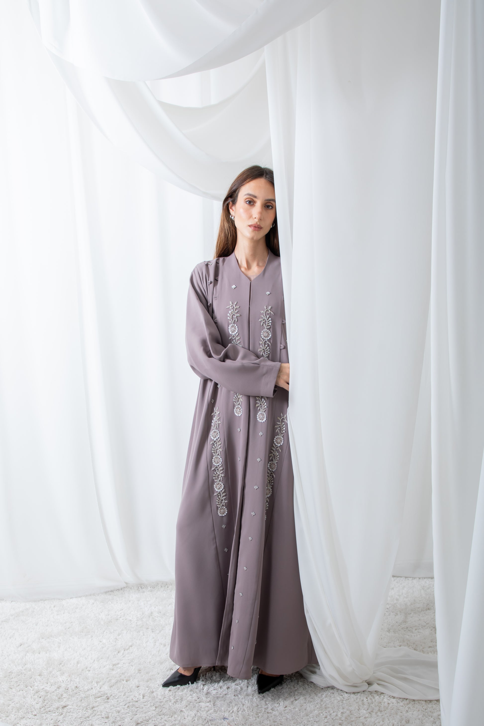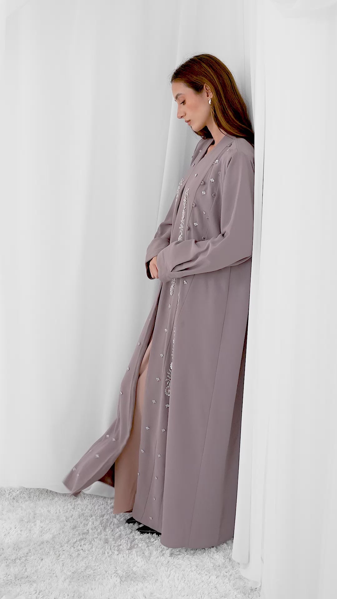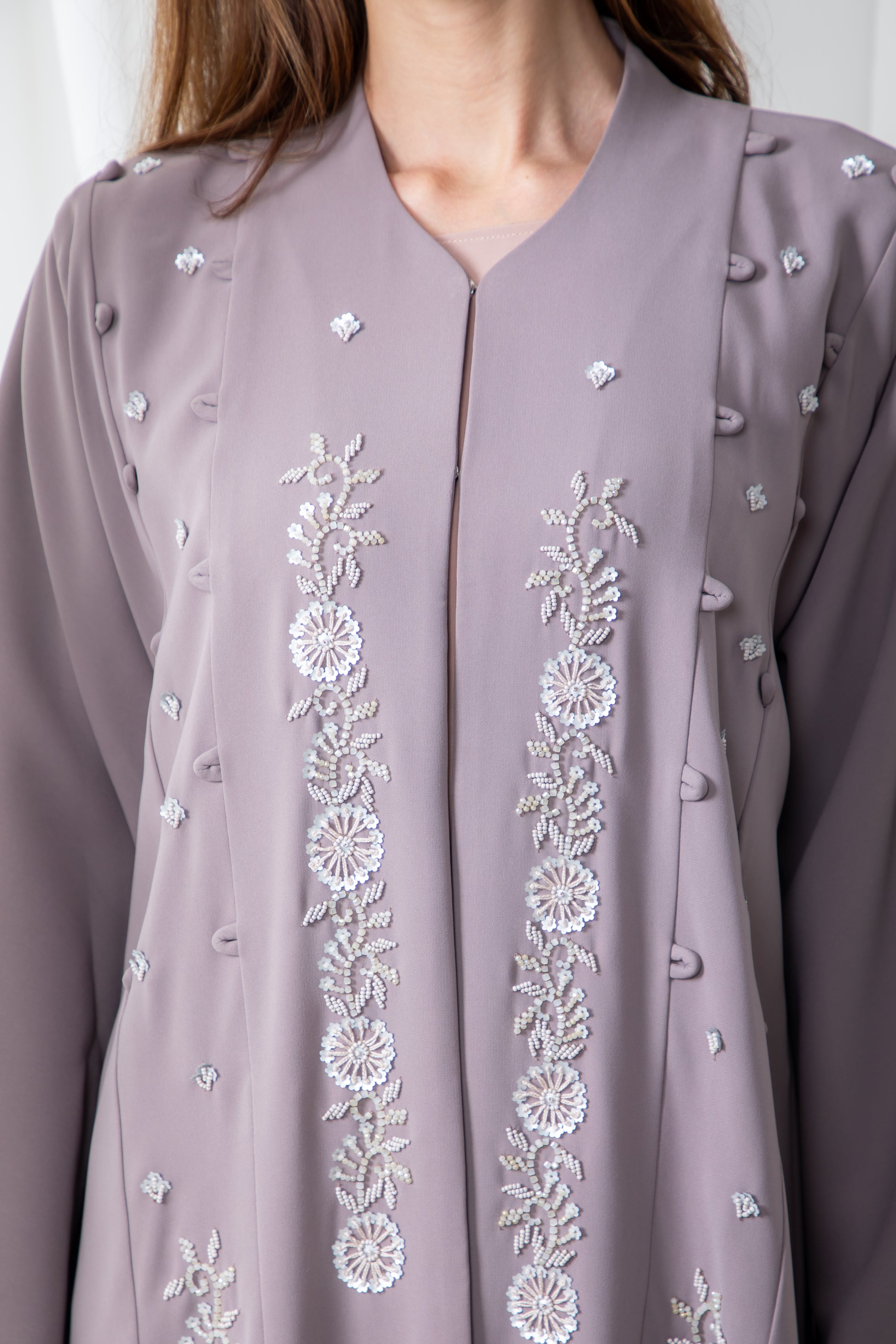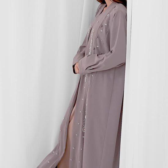 A beautiful, full-length, open abaya in a soft tonal mauve fabric. It is adorned with delicate tonal beading or embroidery in a floral pattern running down the front panels. The abaya is layered over a lighter, matching slip dress, creating a soft and quiet glamorous look.