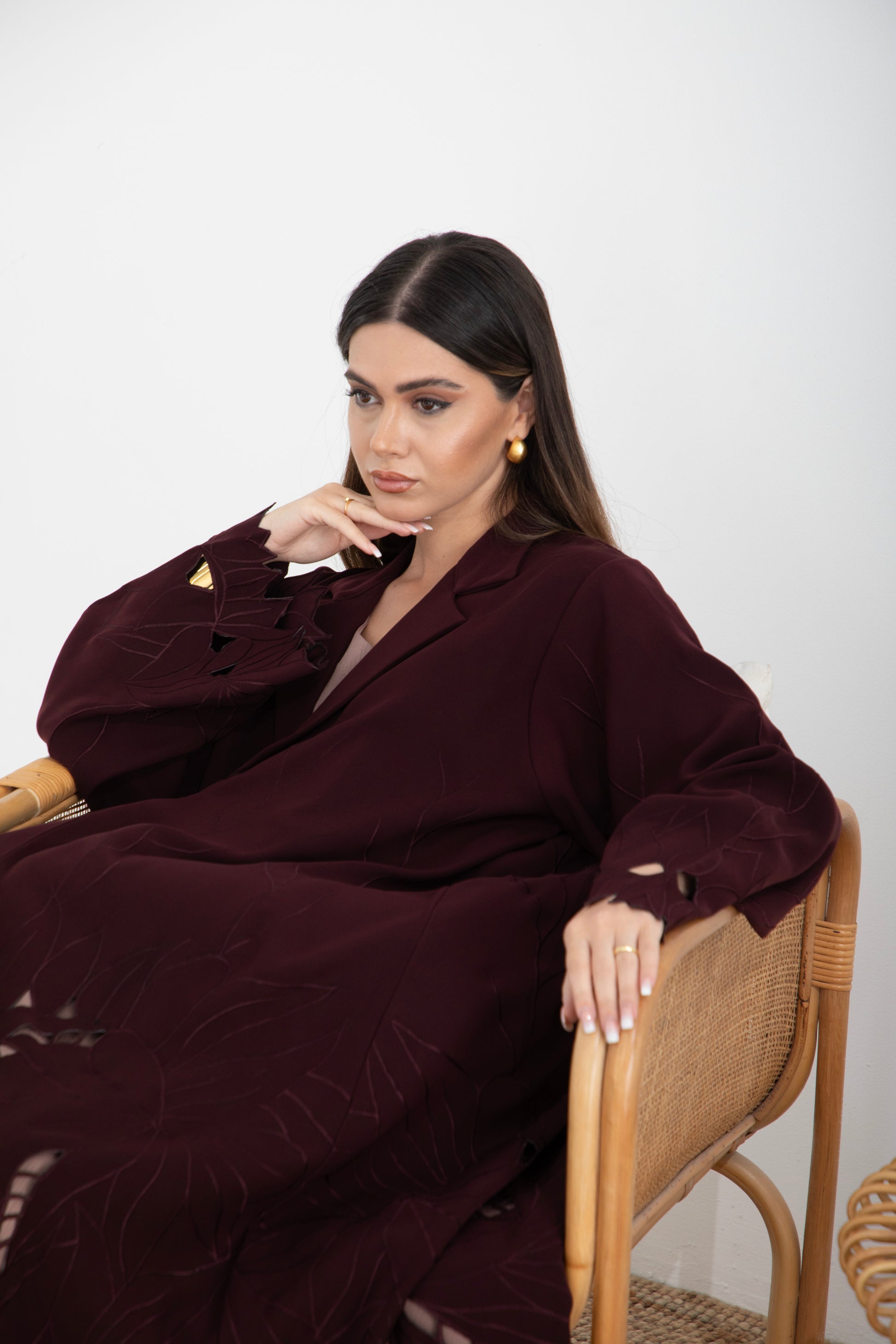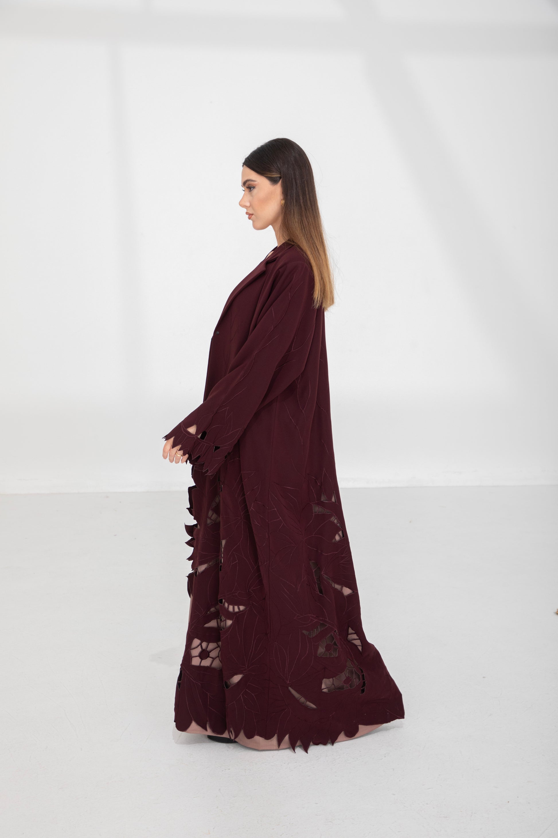 A bold maroon abaya featuring intricate laser-cut leaf patterns, offering a modern twist on modest wear. Flowy, artistic, and effortlessly statement-making.