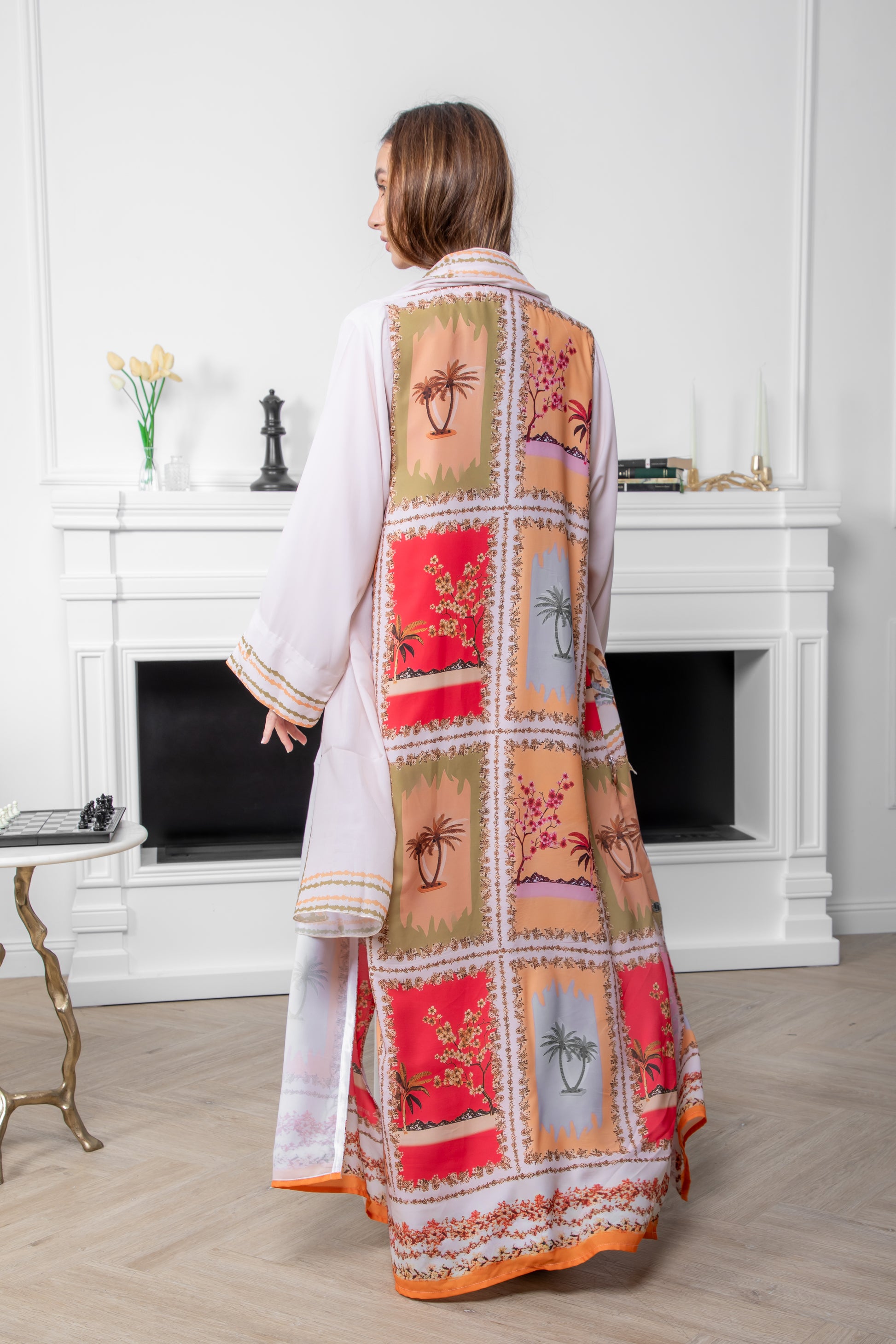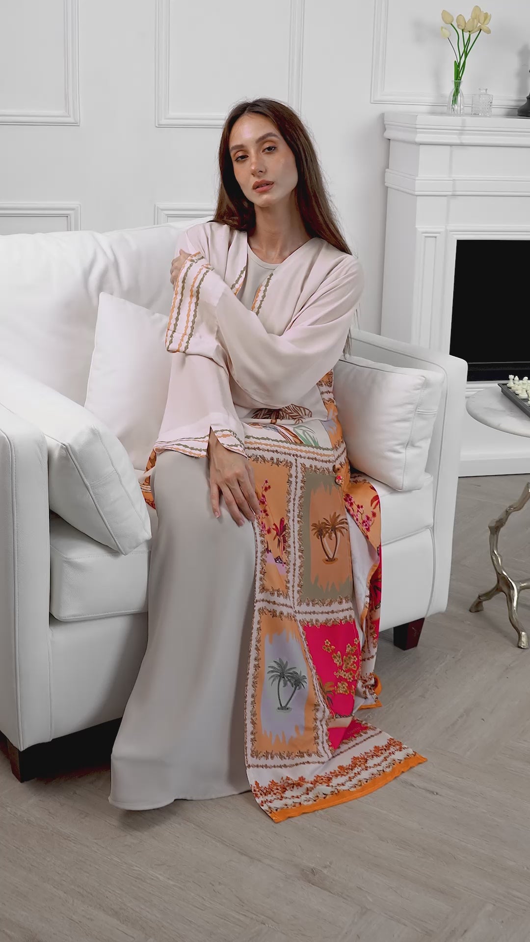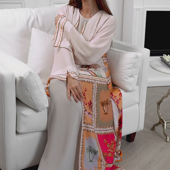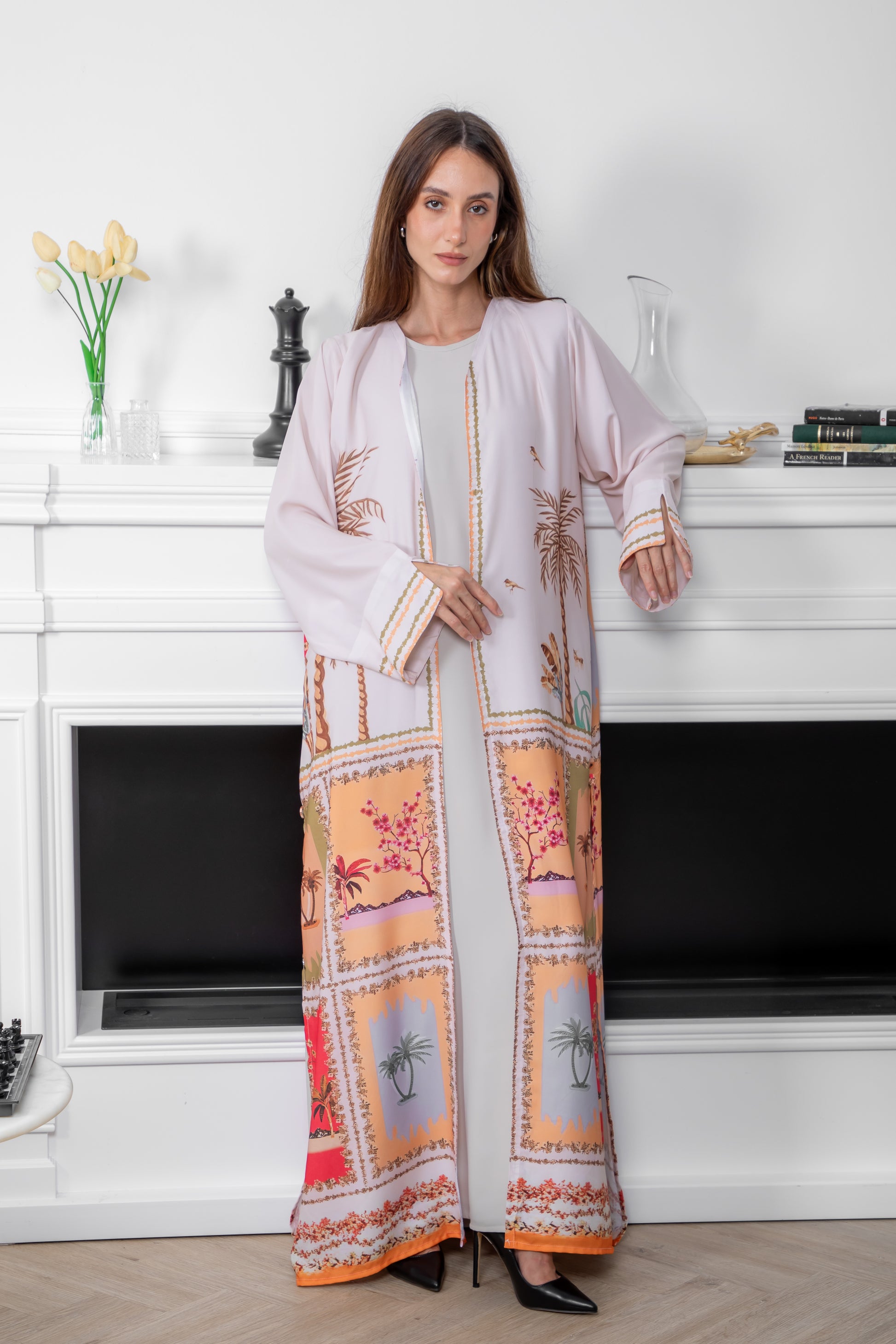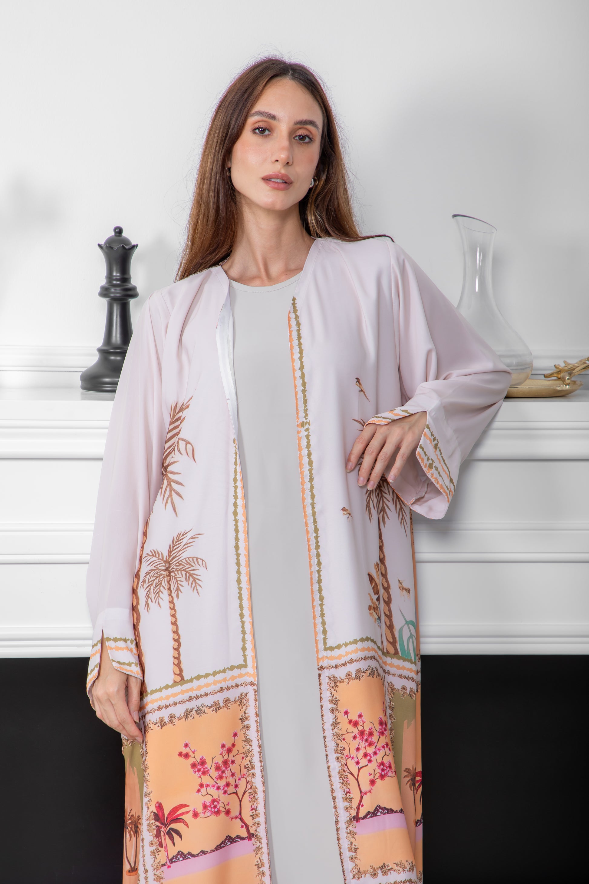 Soft pastels meet desert-inspired motifs in this dreamy abaya. With delicate palm illustrations and warm peach panels, it captures the charm of serene sunsets and gentle breezes.