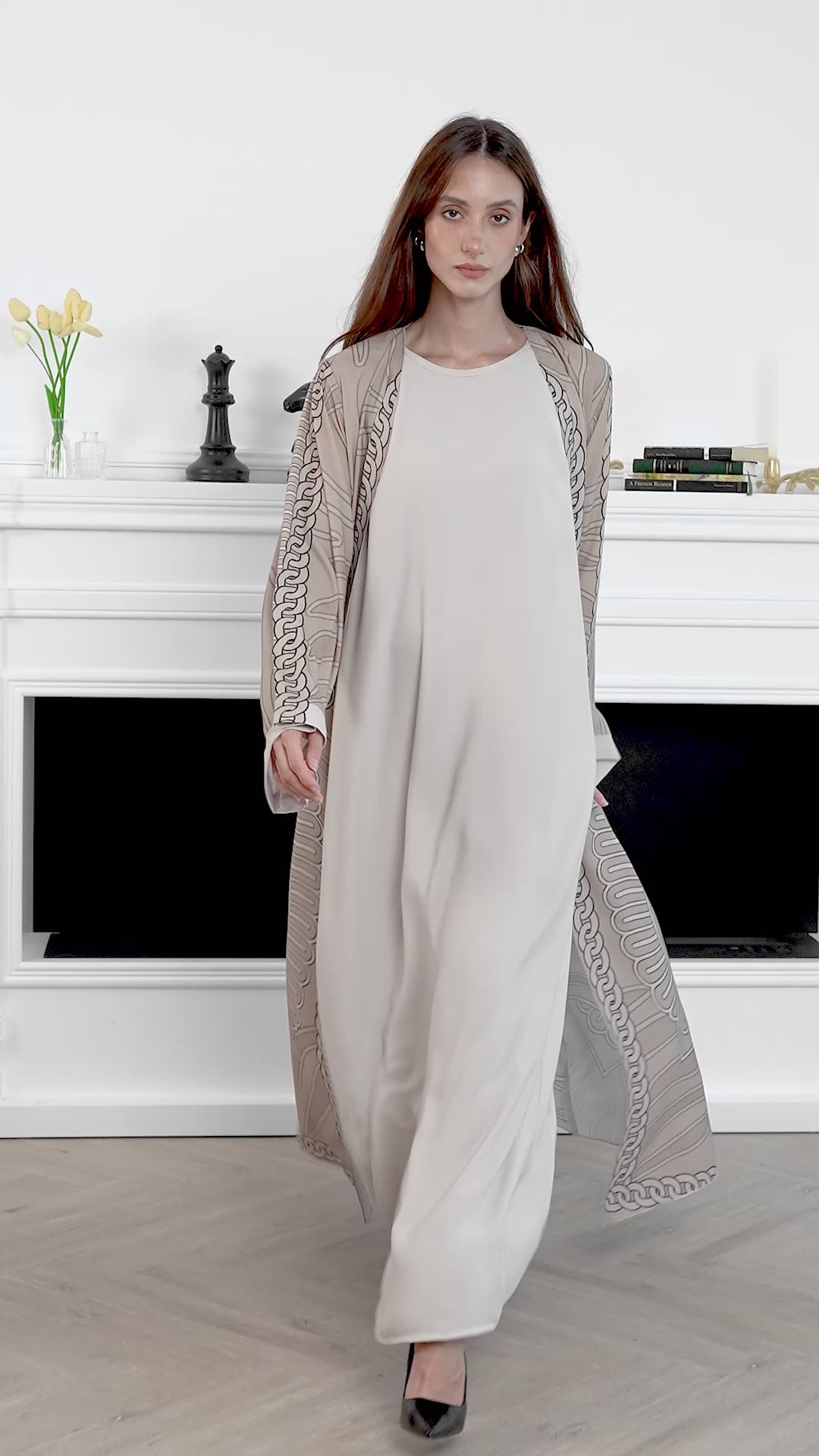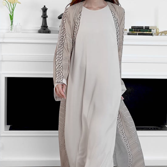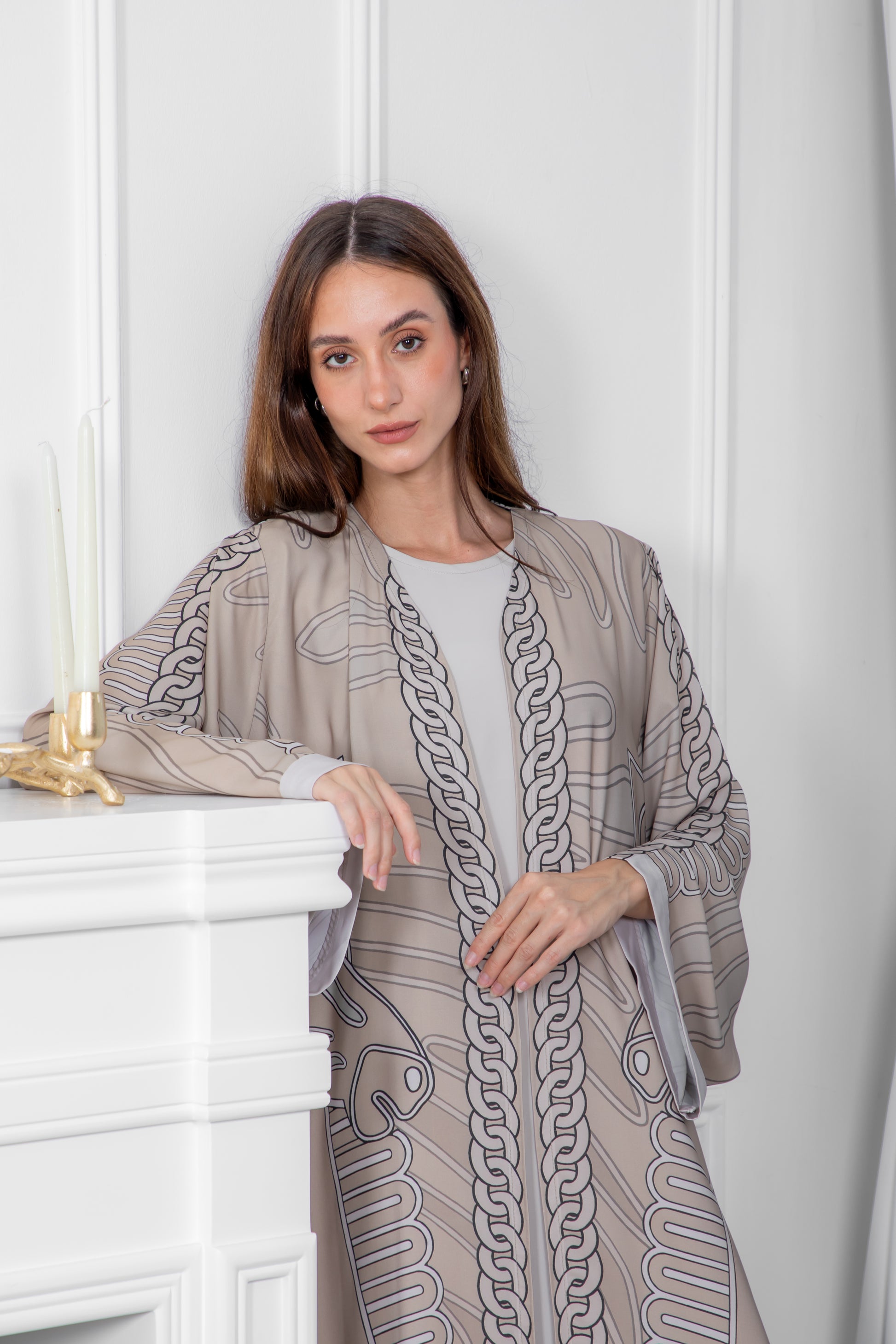 A chic taupe abaya featuring clean, contemporary chainwork patterns. Minimal yet striking, it brings a luxurious modern edge to everyday modestwear.