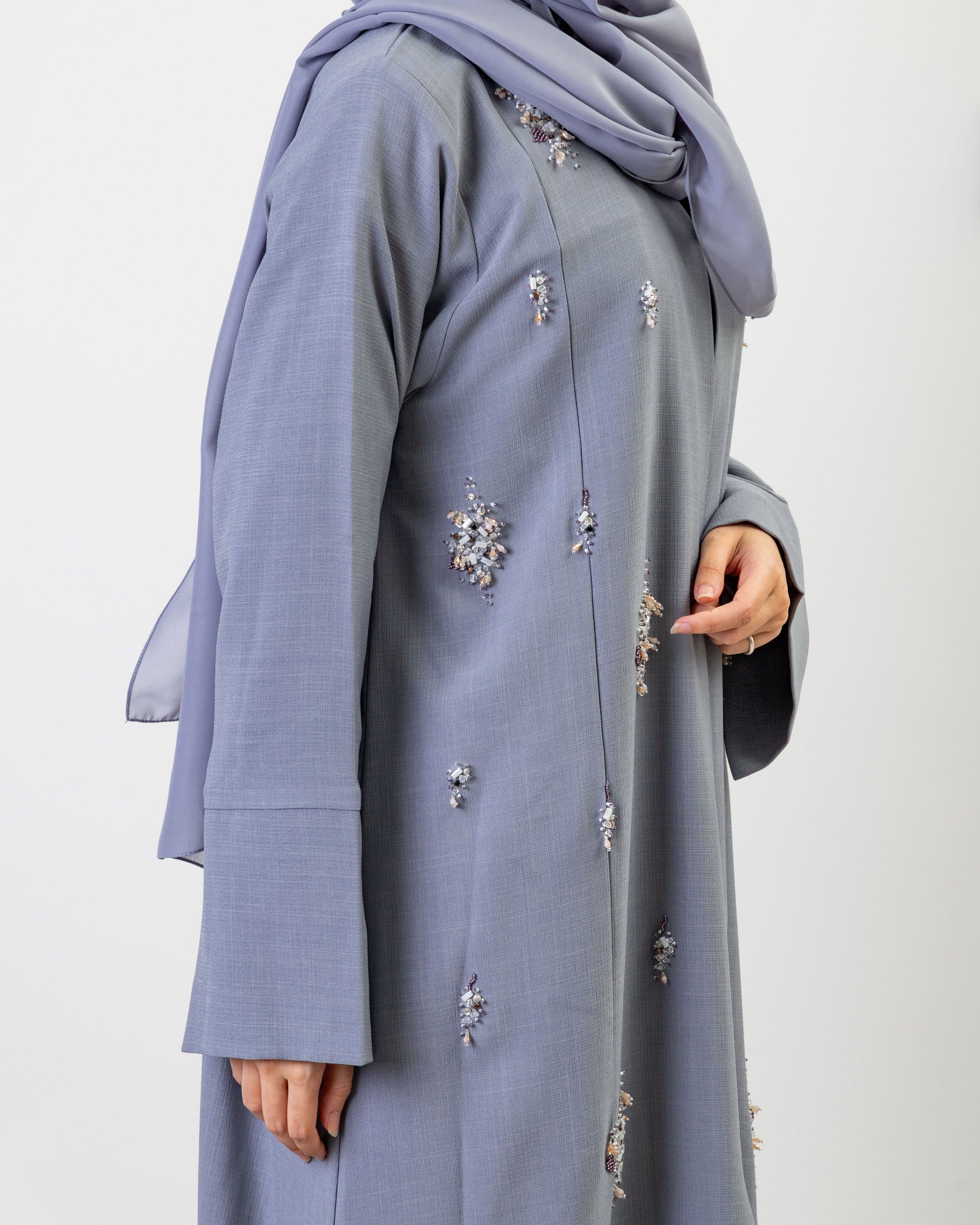 A graceful abaya adorned with delicate hand-beaded floral accents. The soft texture and flowy silhouette make it an elegant choice for daytime events or evening wear. With scattered embellishments adding a touch of shimmer, this piece brings a blend of sophistication and subtle glamour to your modest collection.