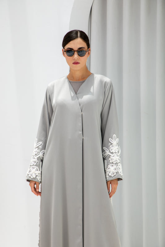 Pearl Grey Embroidered Abaya
