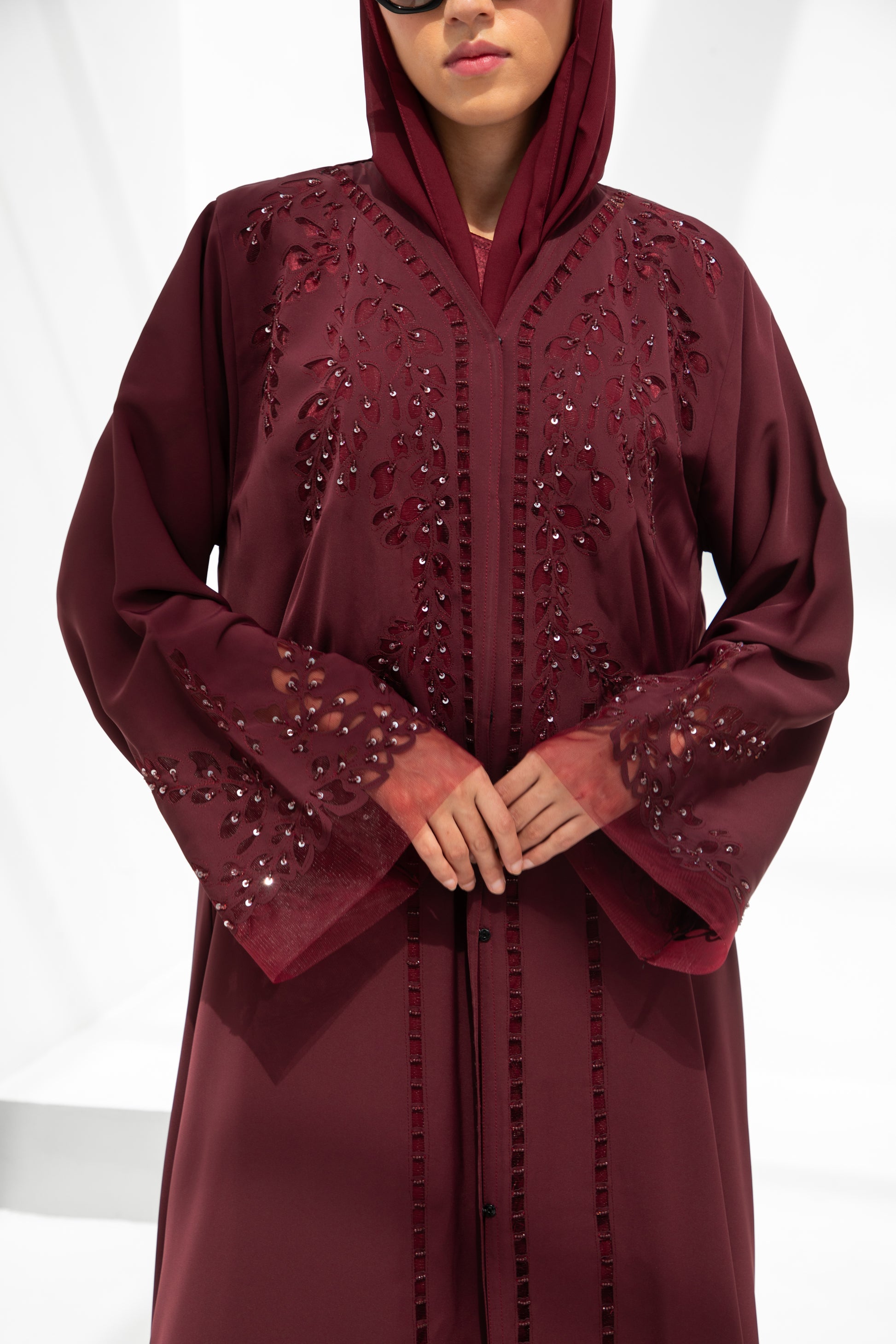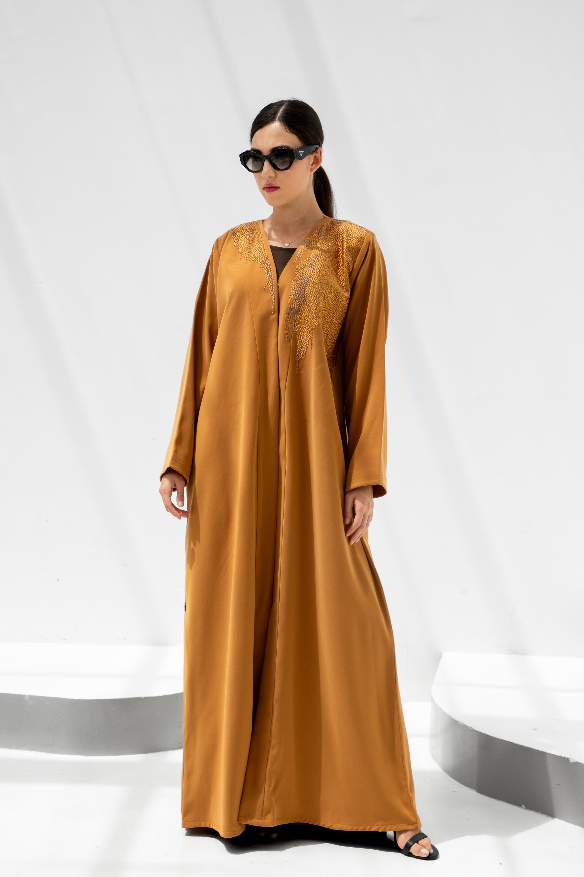 Elevate your wardrobe with this Amber Luxe Abaya, a masterpiece of understated glamour. Crafted from premium linen-blend fabric, it features hand-embellished detailing across the front panels, creating a captivating flow of texture and shimmer. The warm amber hue complements every skin tone, exuding elegance and confidence.