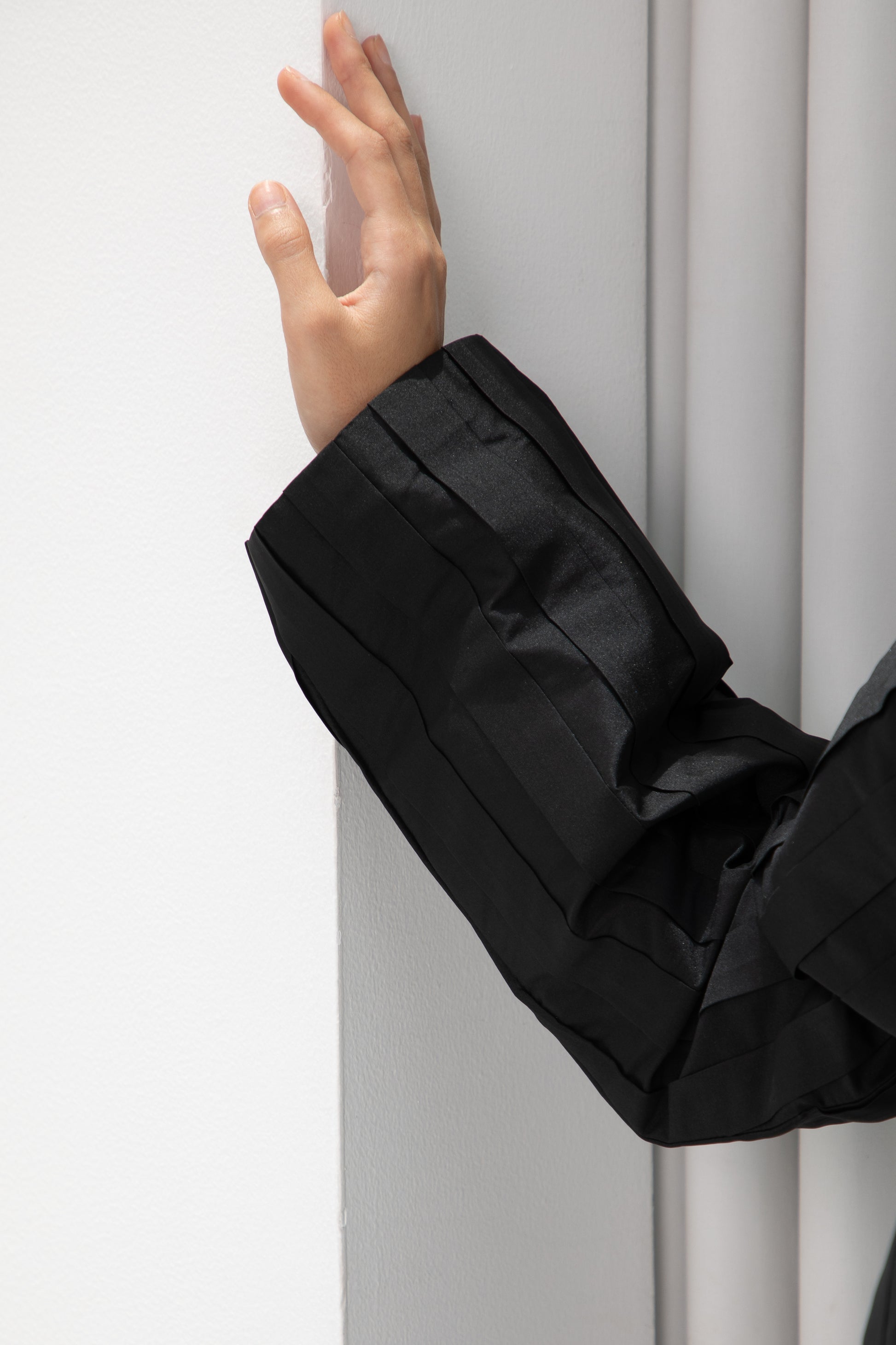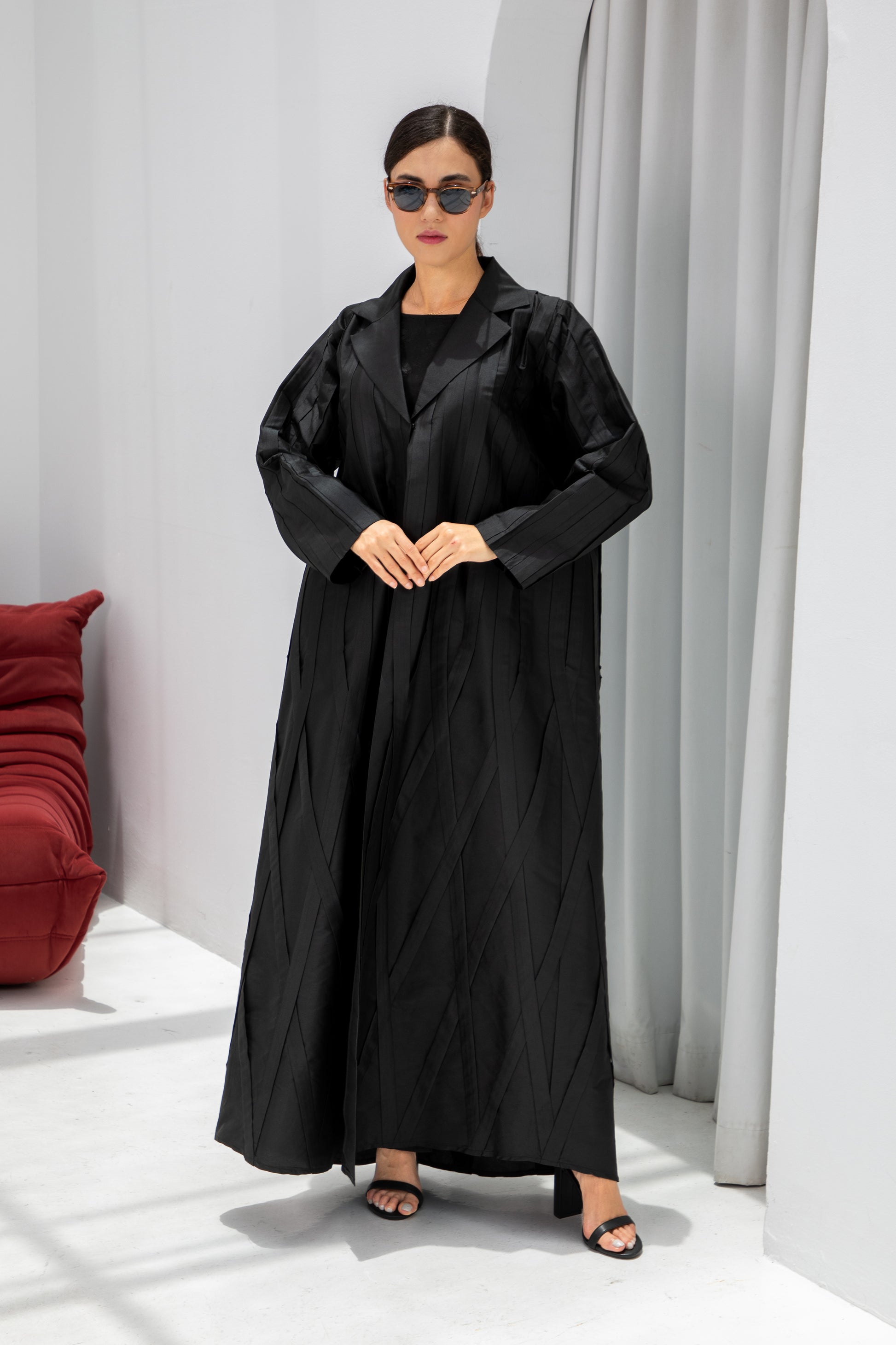 Step into timeless elegance with our Black Aura Abaya. Designed in a rich, deep black, this statement piece features intricate pleating from shoulder to hem, blending structured tailoring with fluid movement. The double-breasted blazer top adds a touch of modern edge, while the flowing silhouette ensures effortless grace with every step.