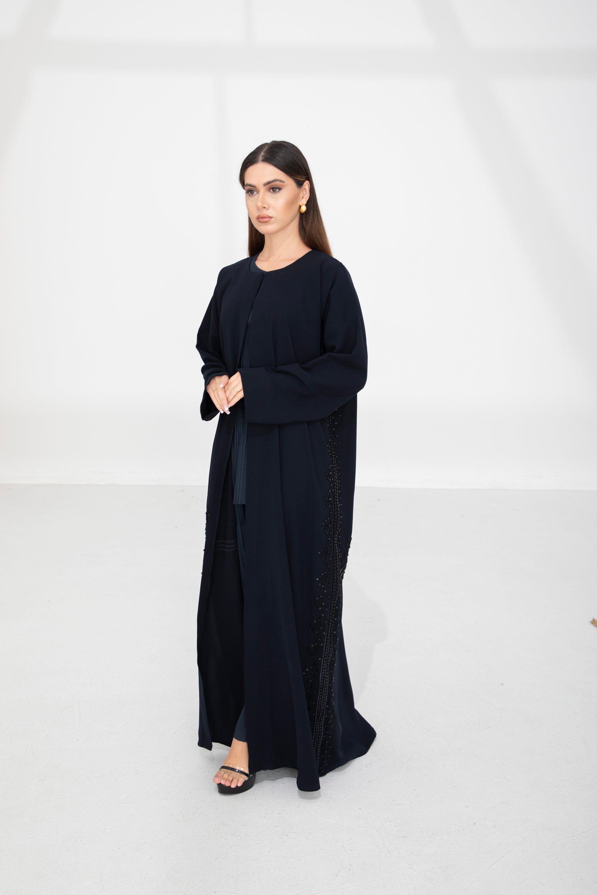 A classic black abaya with elegant bead detailing along the sides. Made from soft, flowy fabric, it offers a comfortable fit and a modest, graceful look—perfect for both everyday wear and special occasions.