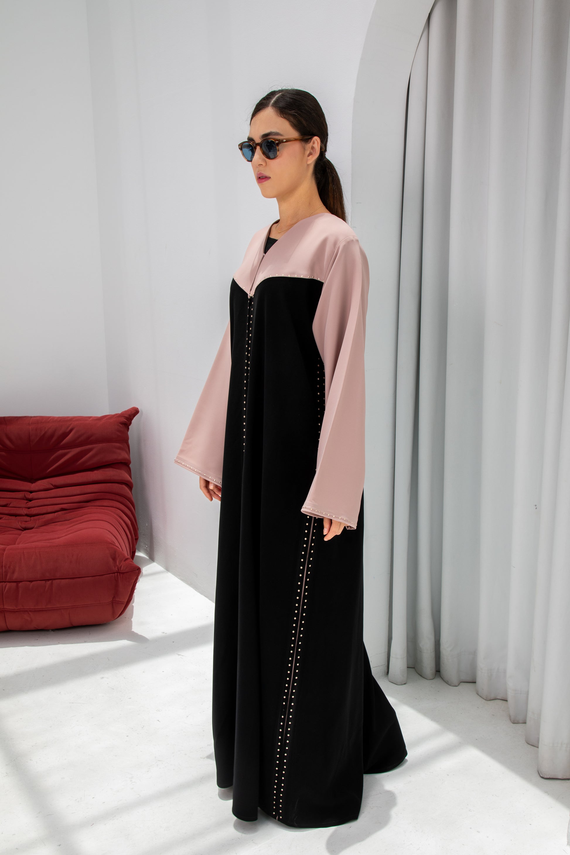 Elevate your wardrobe with this stunning black abaya featuring blush pink sleeves and yoke, finished with a delicate line of stud embellishments. Designed for the modern woman who values both elegance and comfort, this abaya makes the perfect choice for casual outings, evening gatherings, or special occasions. Shop our latest abaya collection and embrace modest fashion with style.