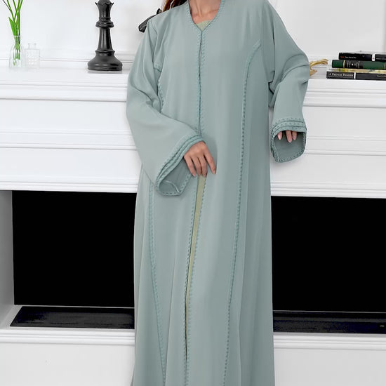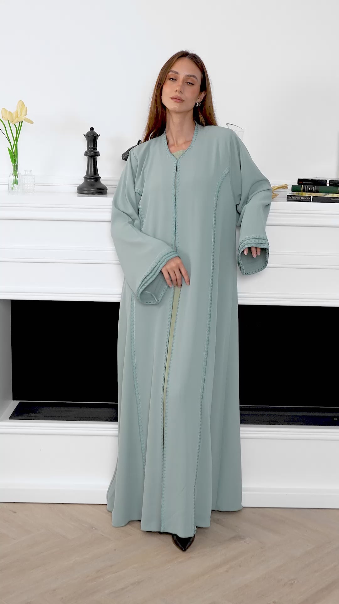 Graceful, calm, and effortlessly refined, the Celadon Serenity Abaya is designed to embody quiet elegance. Rendered in a soft celadon green hue, this flowing abaya features delicate tonal stitch detailing that runs along the front panels and sleeve hems, adding subtle texture while preserving its minimalist aesthetic.