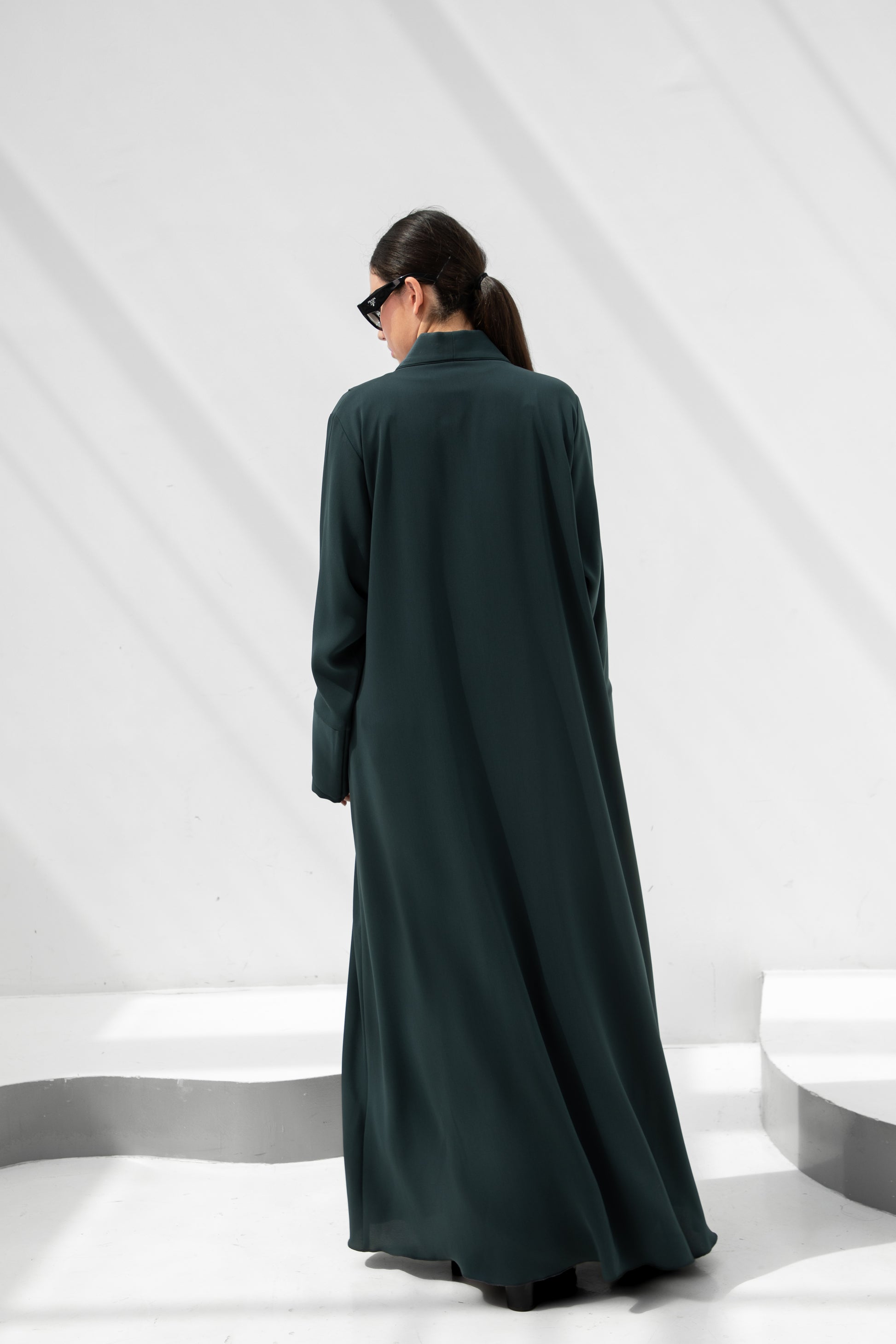 Refined and modern, the Deep Teal Minimalist Abaya features a sleek shawl collar and clean panel lines for a sophisticated look. Crafted from premium crepe fabric in a rich teal tone, it’s accented with fabric-covered buttons for a subtle, elegant finish. Perfect for those who love understated, timeless modest wear.