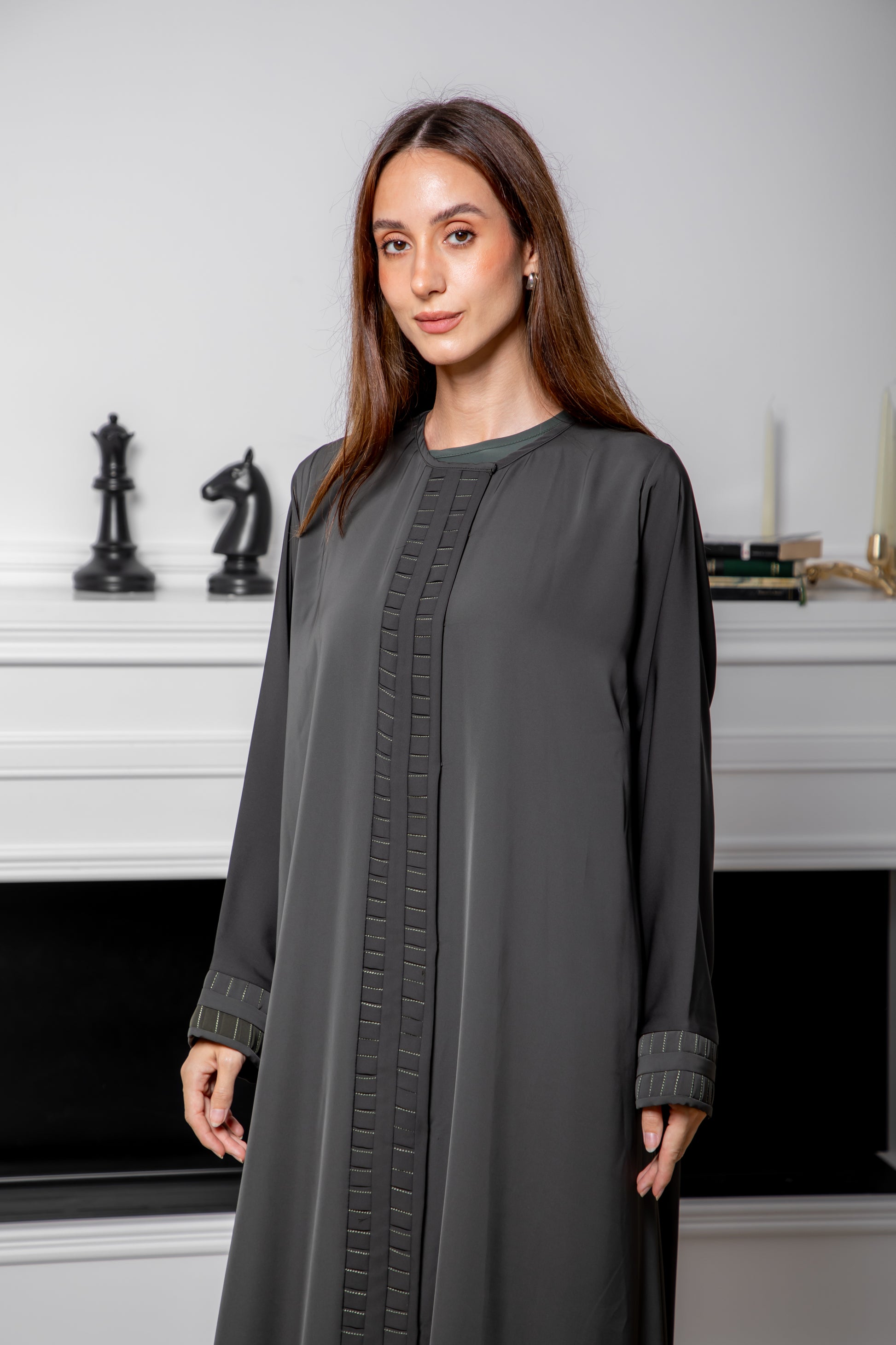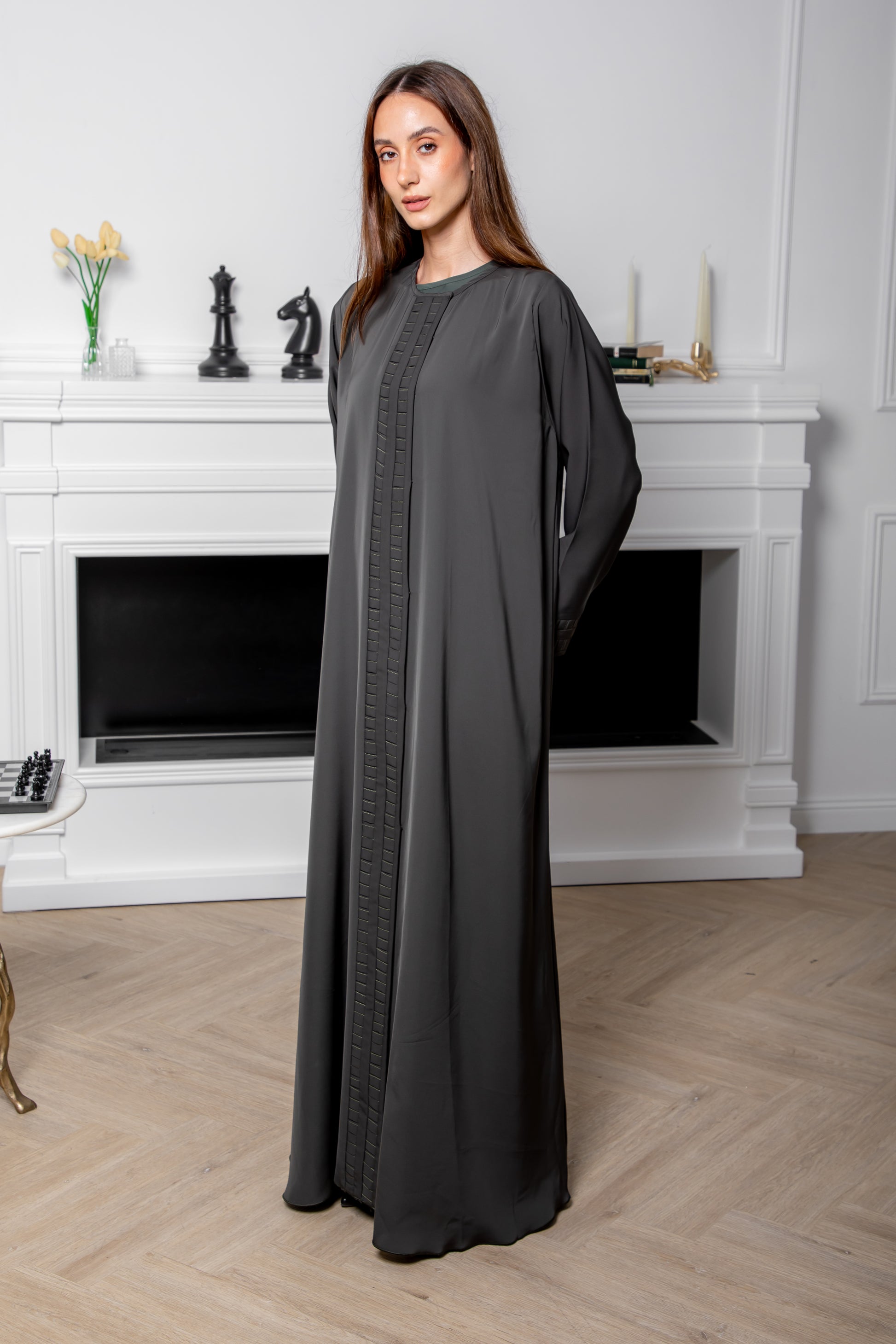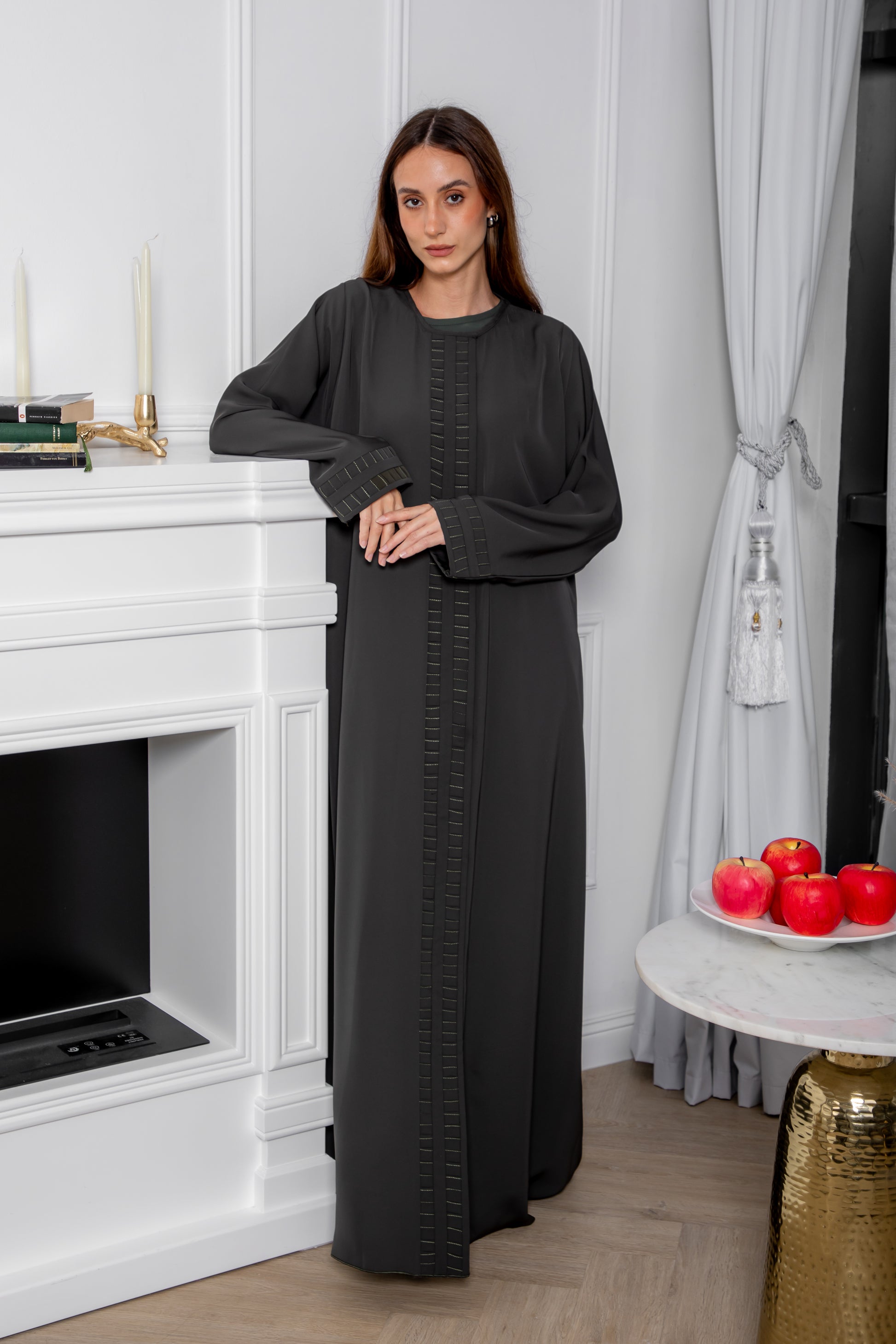 Striking in its simplicity, the Obsidian Poise Abaya is a refined expression of modern elegance. Crafted in a deep obsidian black, this abaya features subtle linear stitch detailing along the front panel and cuffs, adding quiet texture and structure to its minimalist design.