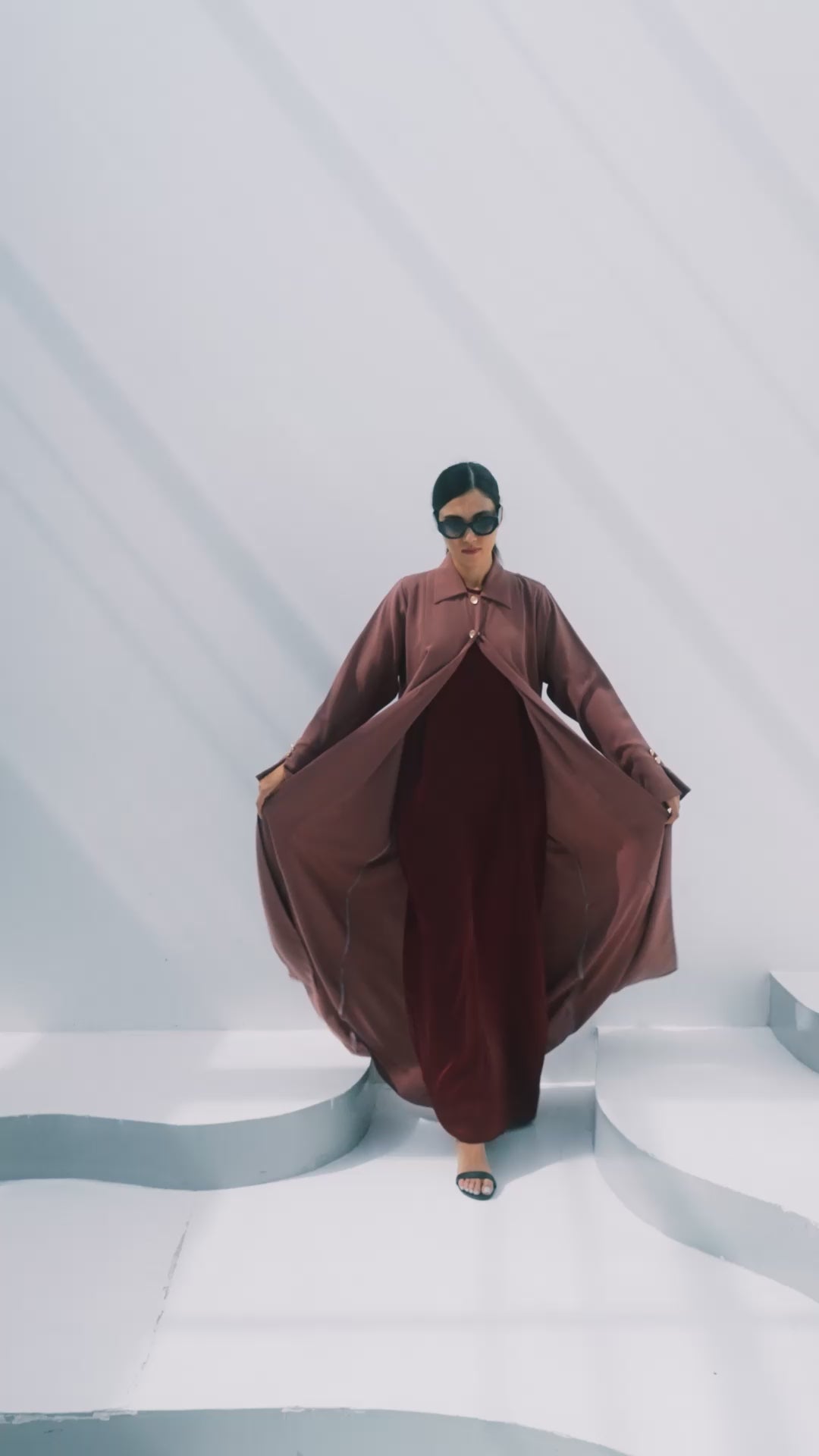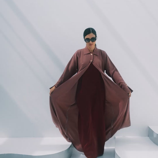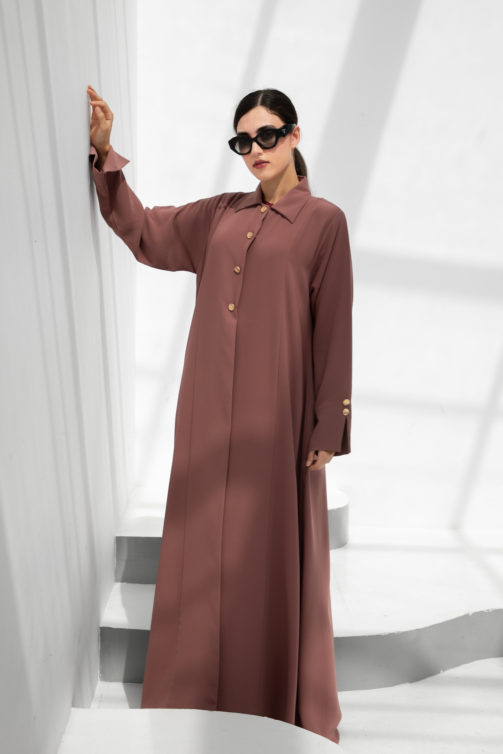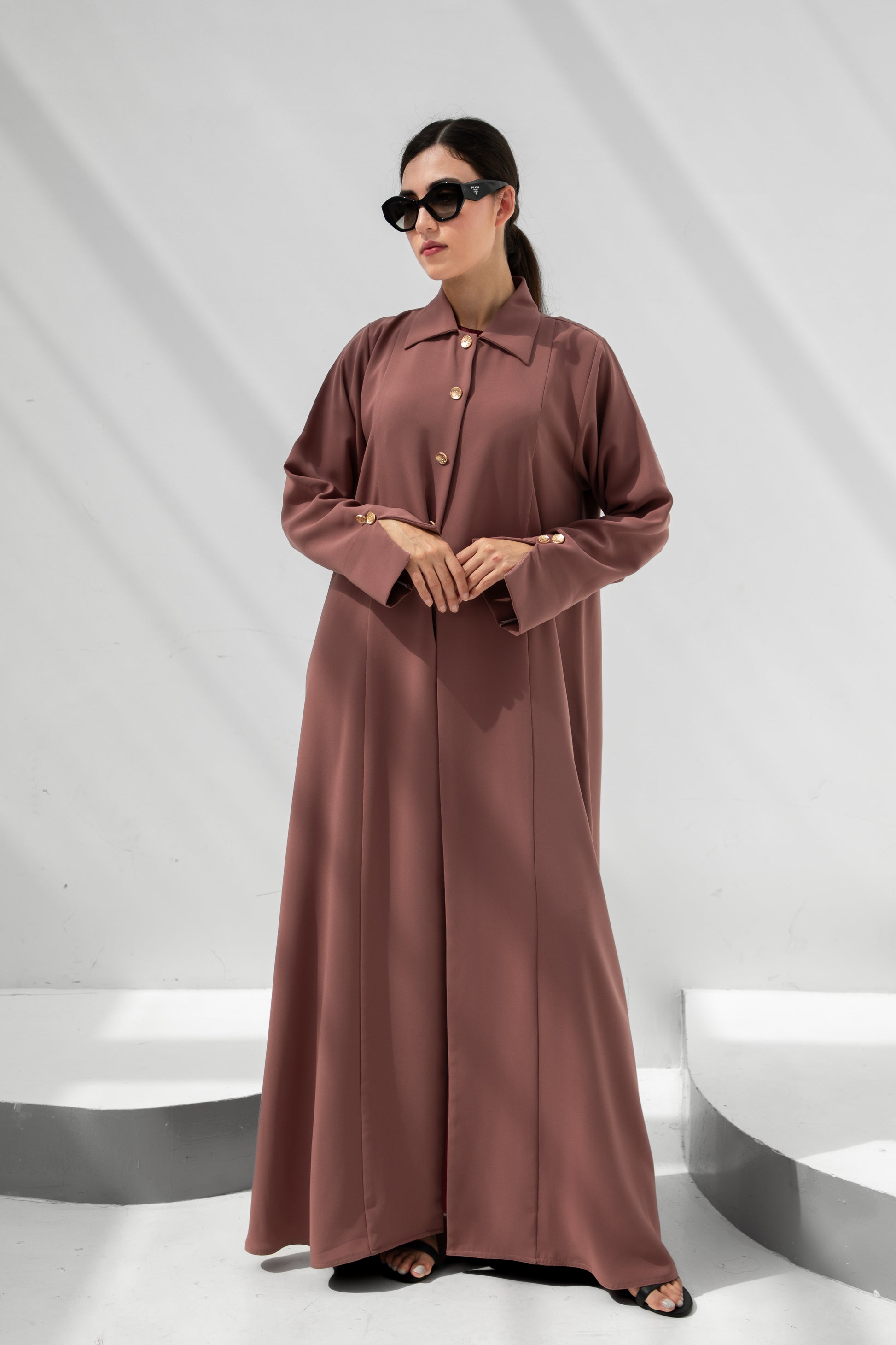 Elegant and timeless, the Rosewood Abaya features a rich mauve-brown hue with a flowing silhouette and luxe gold button detailing down the front and sleeves. Crafted from premium crepe fabric, this abaya offers a refined look perfect for both everyday wear and special occasions. A modest fashion essential that blends comfort and sophistication effortlessly.