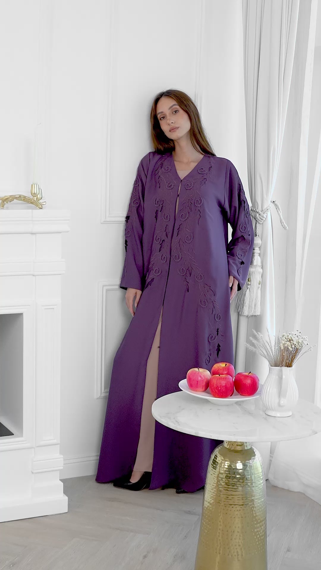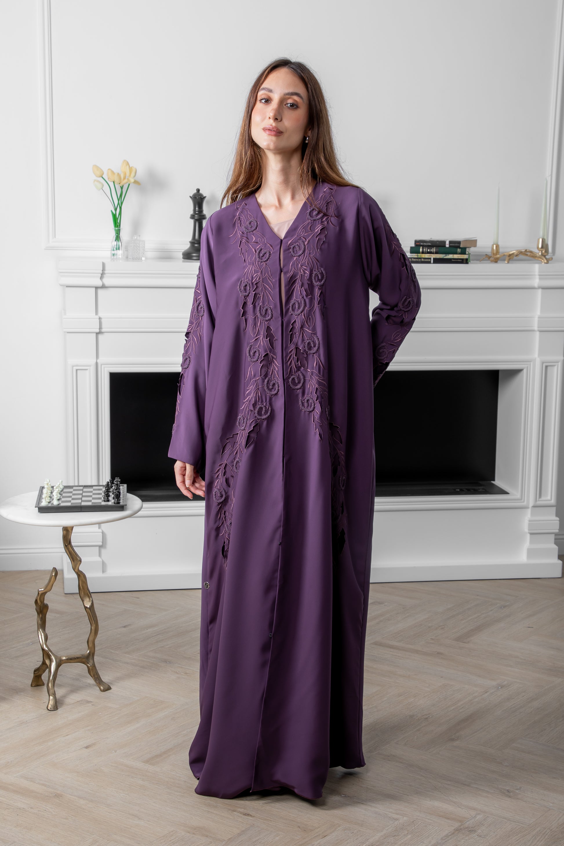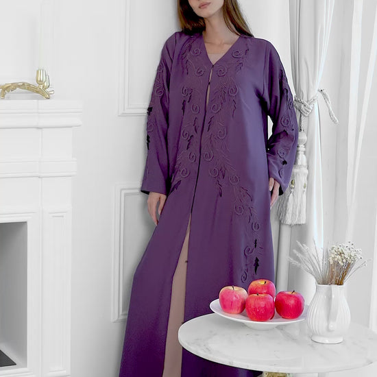 A flowing abaya in a regal amethyst hue, elevated with intricate self-tone embroidery that beautifully frames the silhouette. Soft, elegant, and timeless — crafted for effortless luxury.