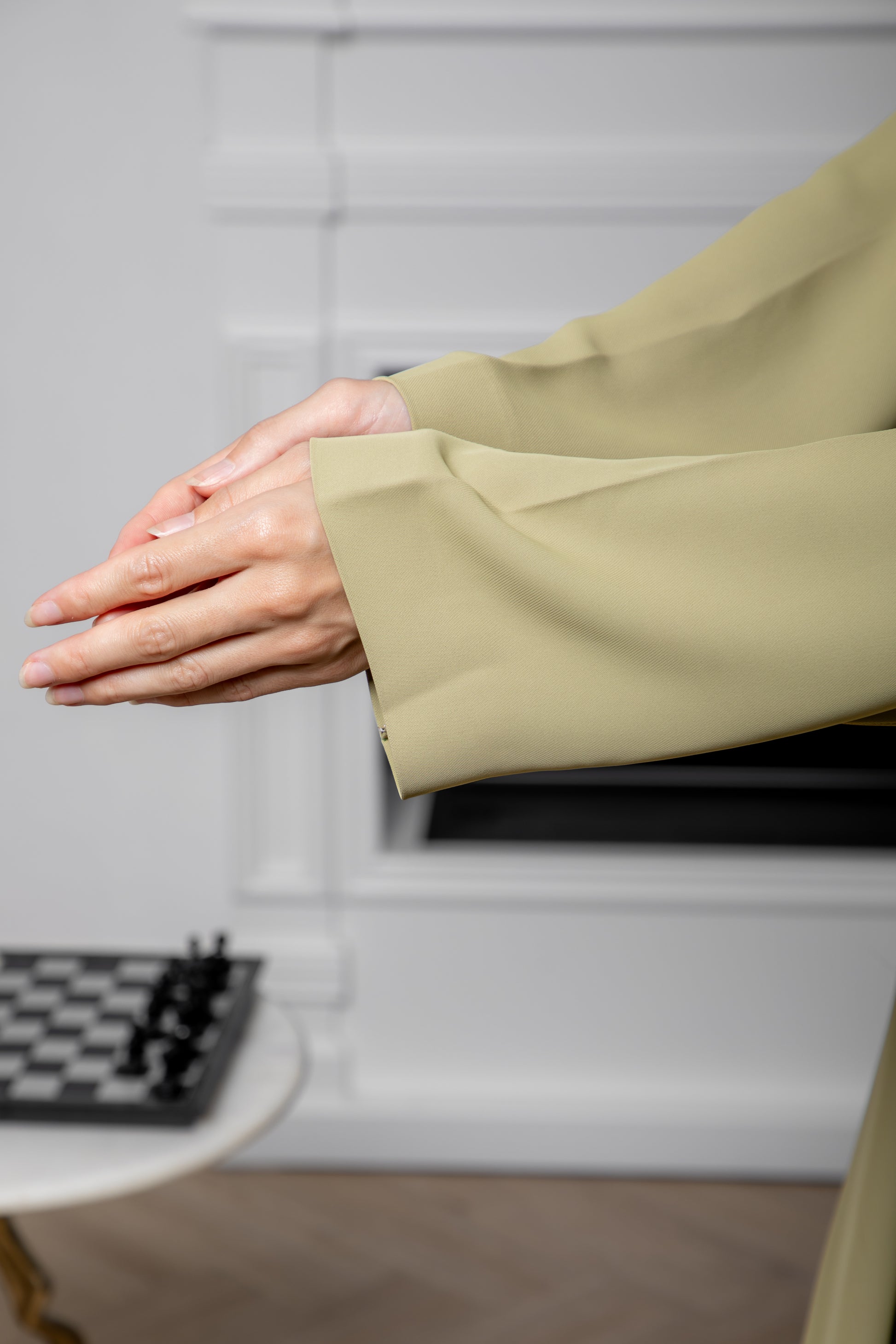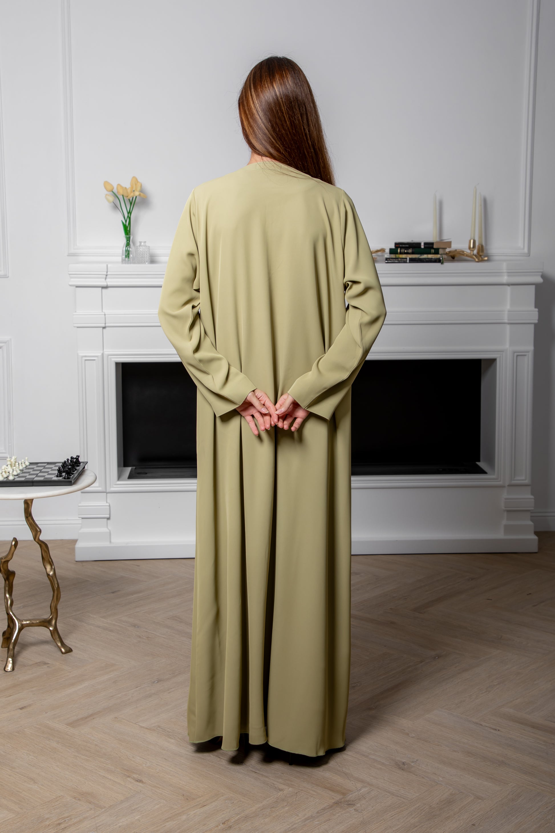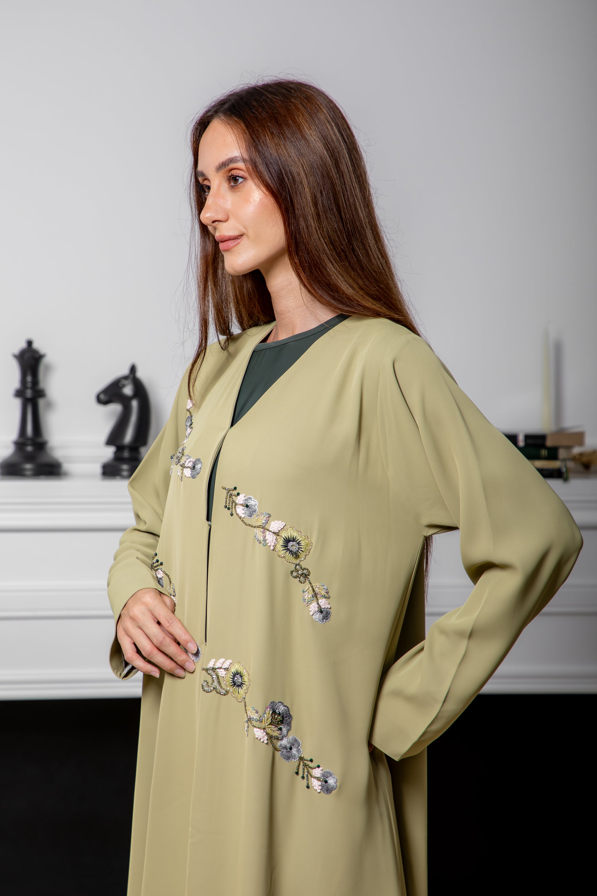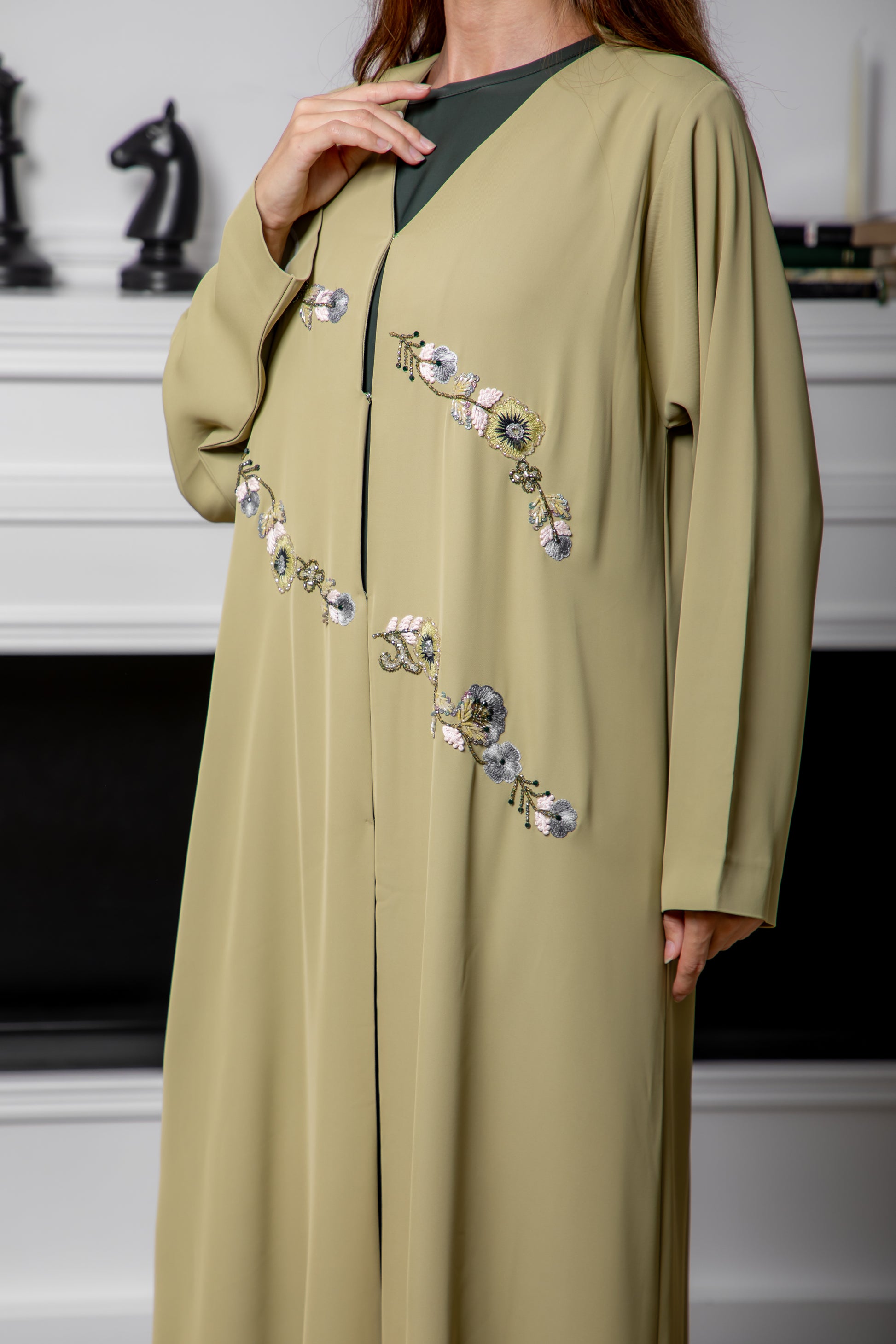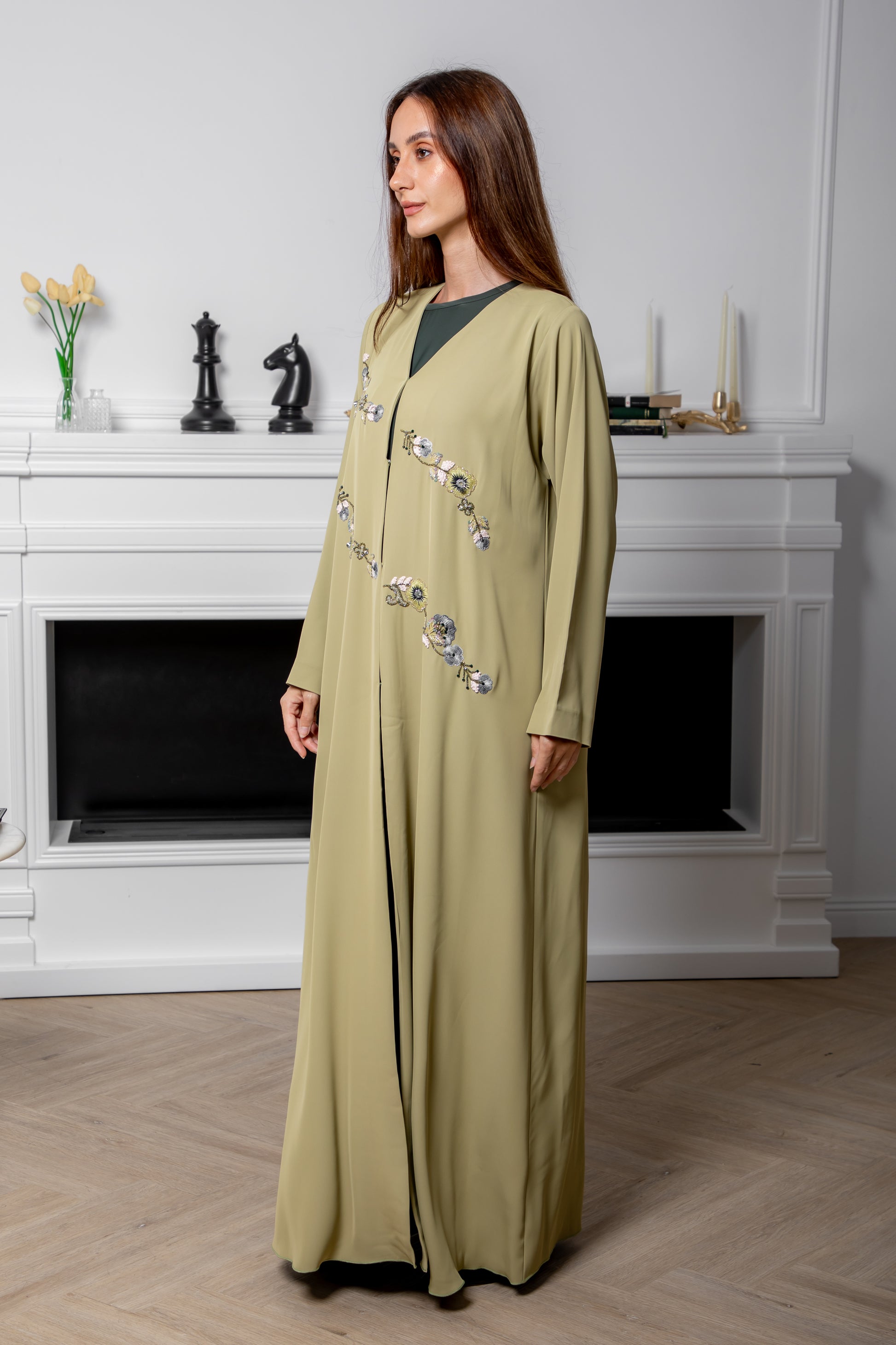 Minimalist yet captivating, this olive green abaya features delicate bead and thread embellishments placed diagonally across the front and sleeves. The subtle shine of the sequins adds a modern, artistic feel without taking away from its soft and modest silhouette. Designed in lightweight, flowy fabric, it offers comfort and refinement in equal measure—perfect for daytime elegance or evening grace.