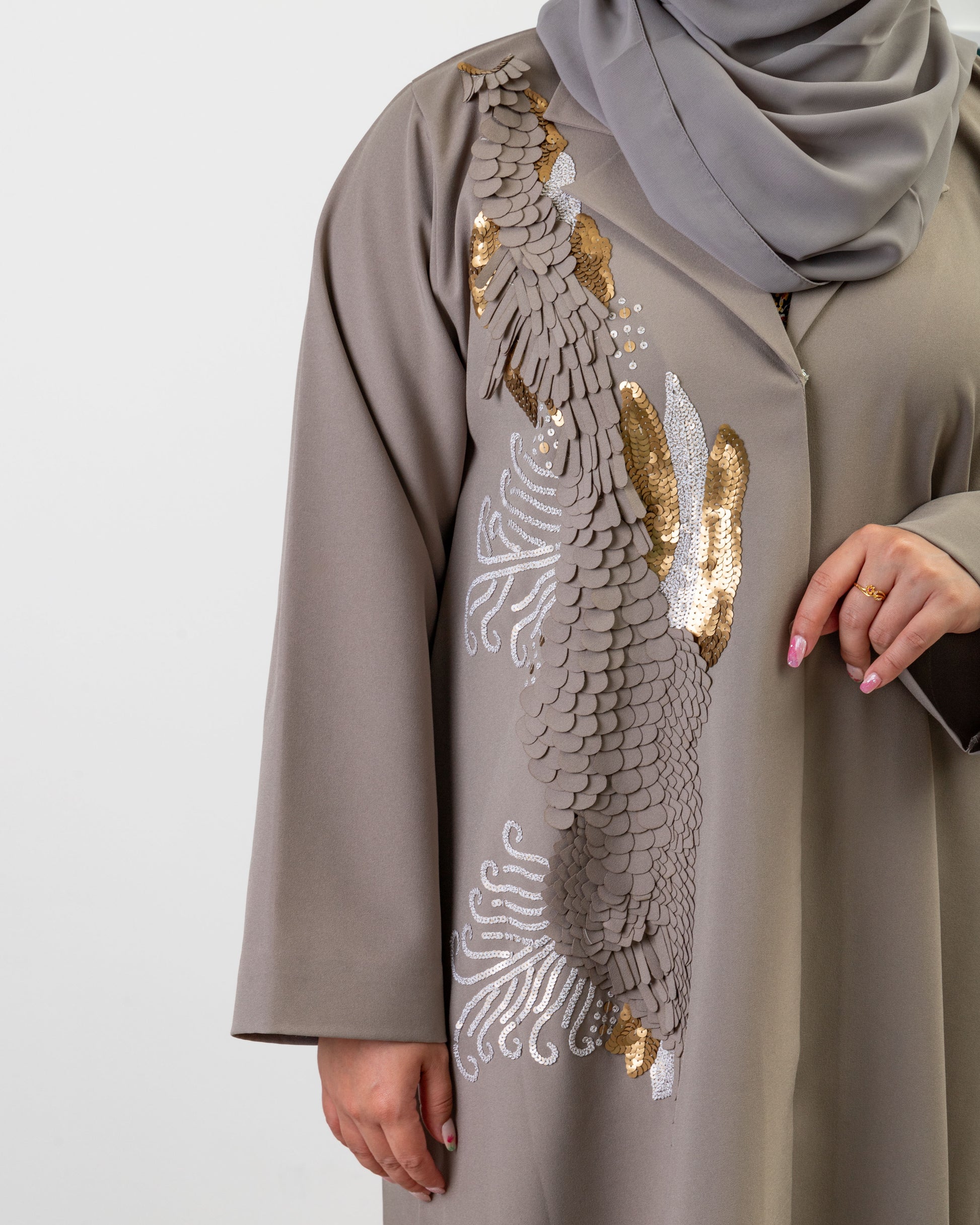An exquisite blend of texture and shine, the Gilded Flora Abaya showcases bold floral embroidery paired with shimmering gold sequin accents and intricate layered appliqué. This statement piece is designed to elevate your eveningwear with a touch of artful elegance and luxury craftsmanship.