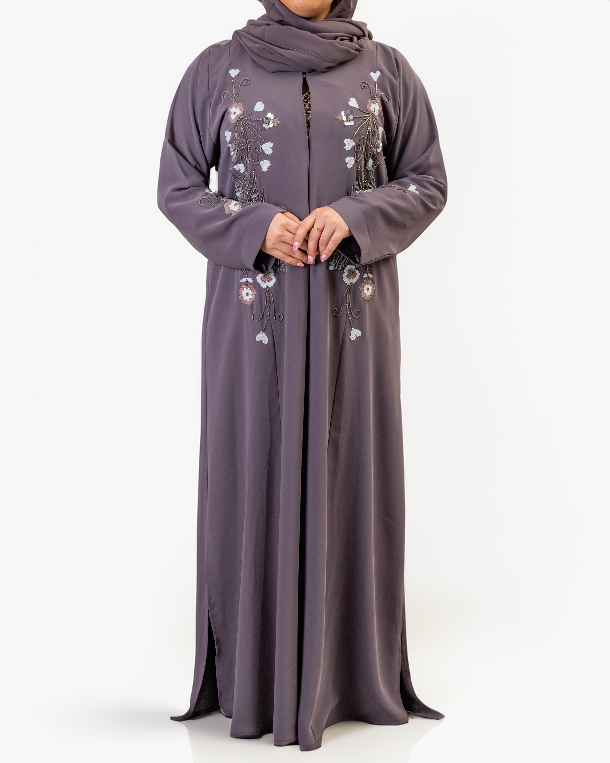 Elegant mauve abaya with floral embroidery, featuring a flowy silhouette and modest design. Perfect for everyday wear or special occasions.